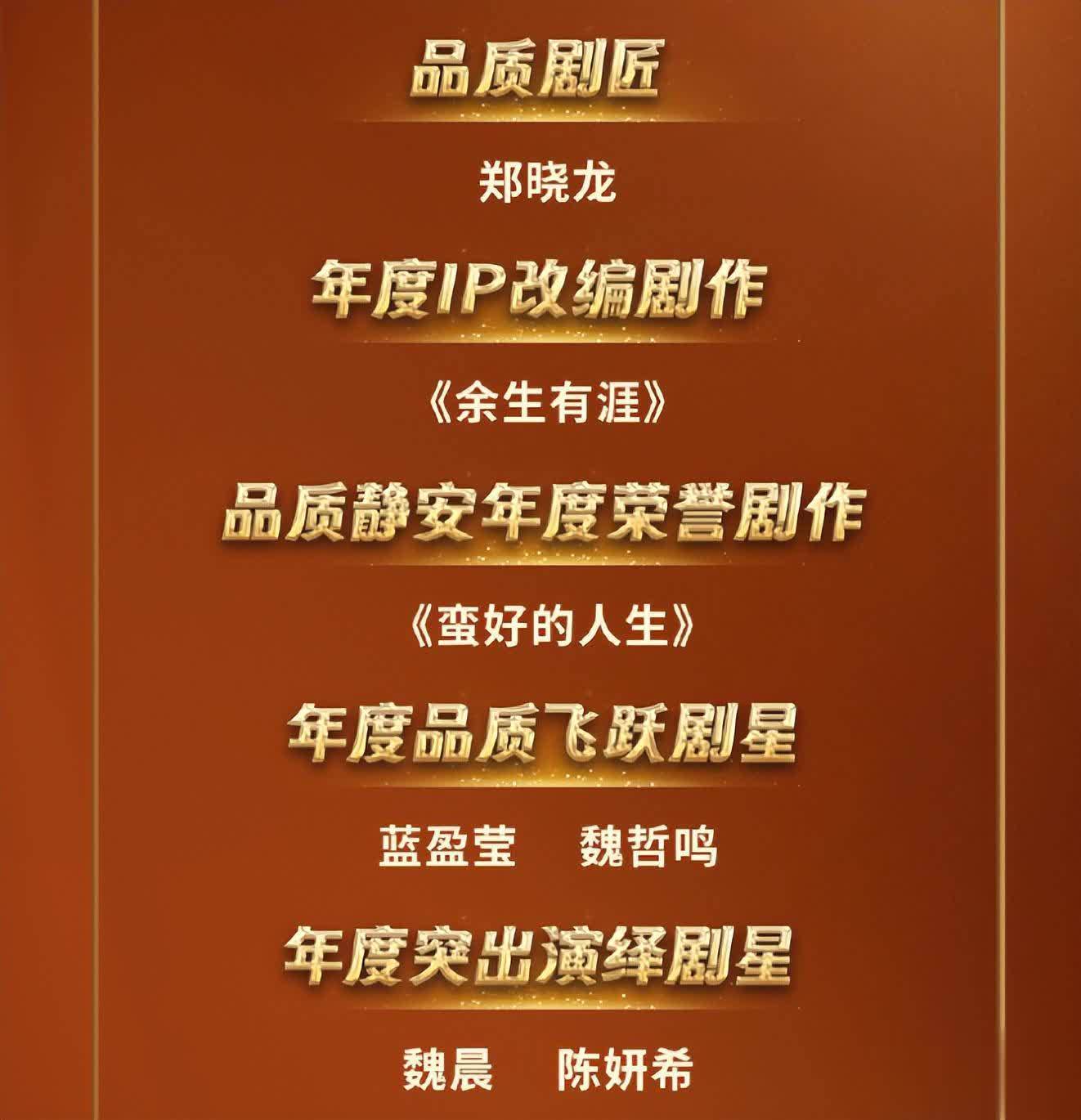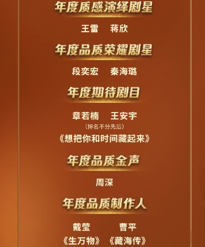 还有一个好消息就是周深又获奖了,看到自己喜欢的艺人和喜欢的歌手都出现在这个名单中,小编更加激动,年度品质金声——周深,他的OST能让剧越来越火,你们喜欢听他的歌吗?